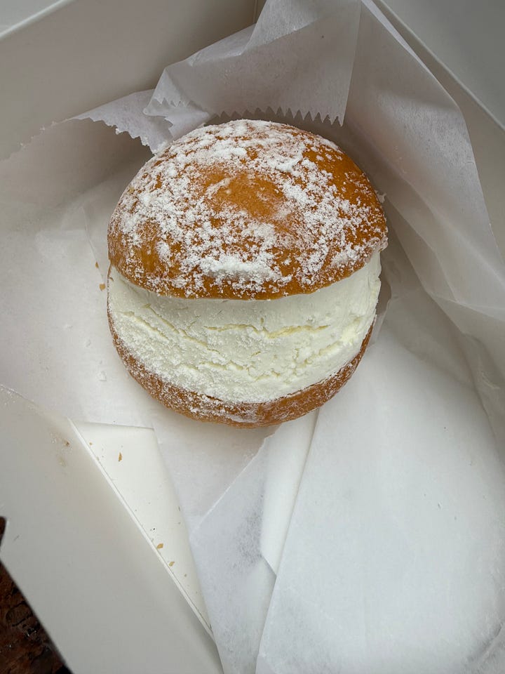1:45 PM - I swap snacks with Veronica: bagels for miniature maritozzi, stiff from refrigeration that makes it neater journey from hand to mouth in the dark. She also supplies sugar cookies bathed in brown butter and sage.