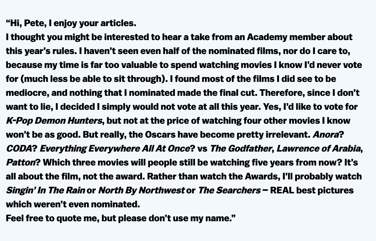Awards season, if you don’t know, sustains its own cottage industry. Entire columns and columnists are devoted to thinking about the Oscars year-round, and Oscar campaigns require money—serious money—to keep a film circulating in voters’ minds. That means awards often, but not always, follow the movies and nominees with the most buzz and visibility. This year, the Academy introduced a rule requiring voters to check a box confirming they’ve watched all the nominees. A little bit of friction that, anecdotally, has some voters opting out altogether rather than pretending. This email, from what we can say, is probably from a well-known filmmaker and past nominee to Pete Hammond, columnist at Deadline, gives you some insight into what things are really like: